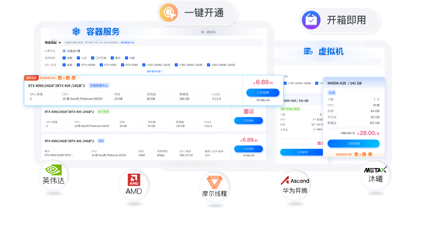 2搭载英伟达、AMD高规格算力卡, 适配部署、推理、训练,支持灵 活拆分、按需启停,提供超长免 费使用权。